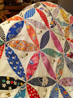 This is a Joseph's coat (similar to an orange peel but with six spokes) that was hand stitched by my grandma Hazel Millard in the 1940's-1950's. I am slowly hand quilting it, because it deserves to be hand quilted.